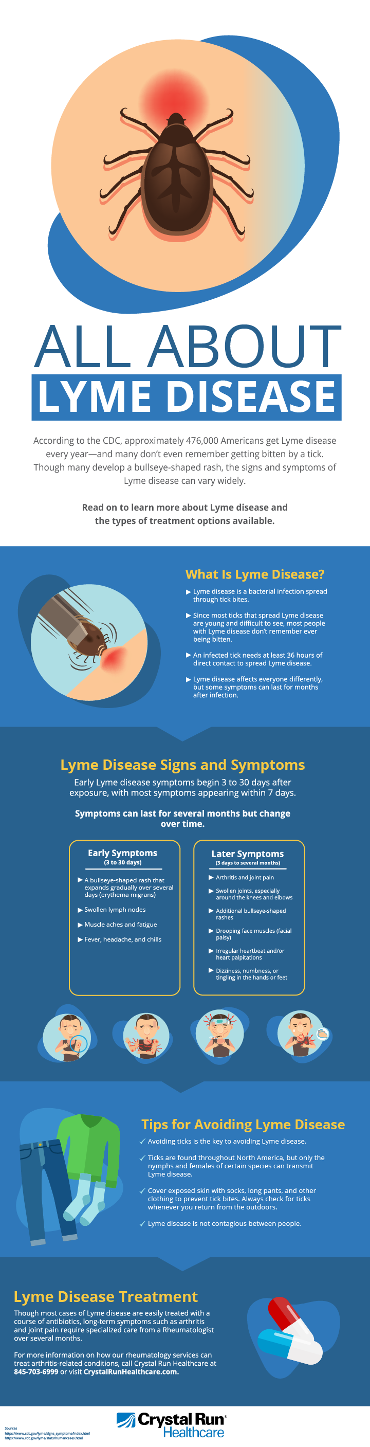 If you or someone you know is experiencing Lyme disease symptoms, you may be looking for more information. This infographic from Crystal Run Healthcare contains important facts about Lyme disease, ways to protect yourself, and the treatment options that are available to you.